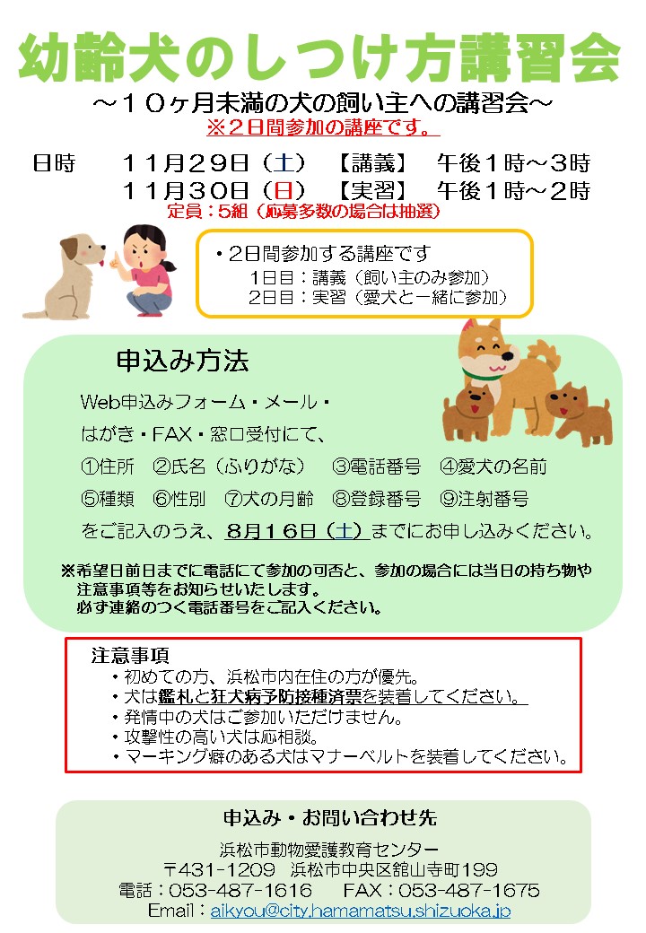 30(日) | 幼齢犬のしつけ方講習会【実習】午後1時~2時※要予約 |